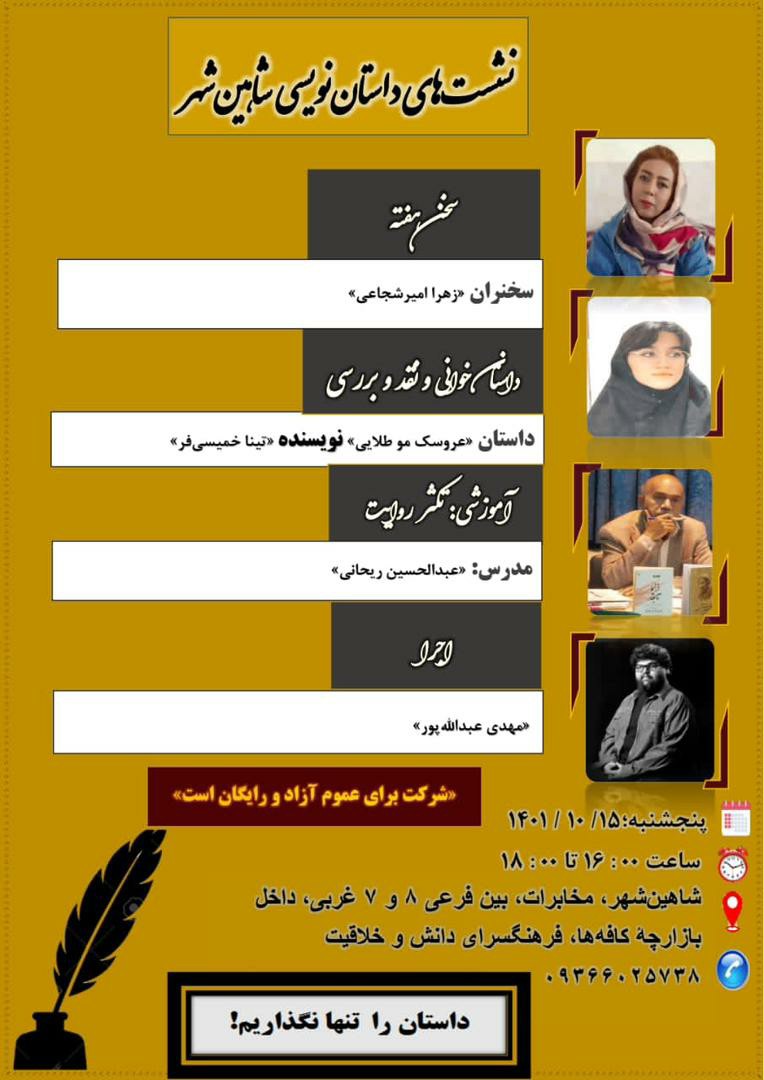 نشست داستان نویسی شاهین شهر با حضور گرم دوست داران ادبیات و داستان نویسی برگذار گردید.